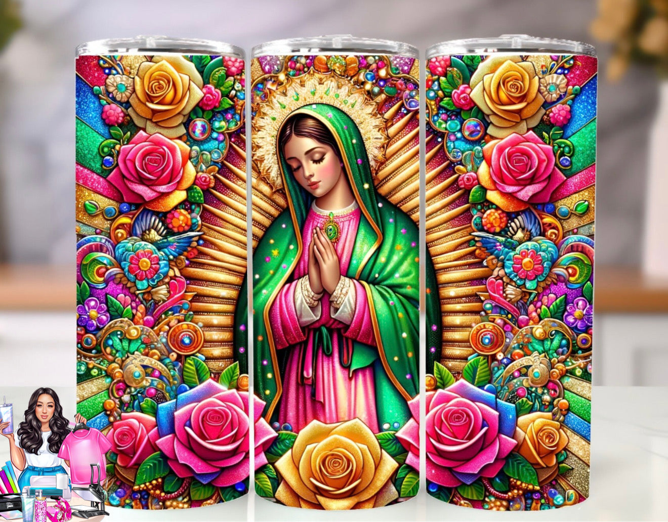 "Embrace boldness with the Mary Rose stainless steel tumbler. Featuring the Virgin Mary and colorful roses, this 20 oz tumbler will keep your drinks hot or cold while inspiring you on your next adventure. Take risks and stand out with this unique design!"
